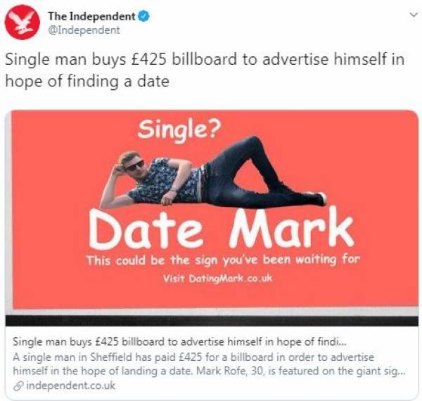 انڈی پنڈنٹ انگلش کی رپورٹ کے مطابق اشتہار لگوانے تیس سالہ مارک کاتعلق برطانوی شہر مانچسٹر سے ہے۔ اور اس نے یہ بل بورڈ لگوانے کیلئے 86ہزار676روپے خرچ کئے۔ مارک کاکہنا ہے کہ ان کا کوئی بھی دوست سنگل نہیں رہا اس لئے انہیں اپنا اکیلا پن زیادہ تکلیف دہ محسوس ہونے لگا تھا۔رپورٹ کے مطابق موصوف کی یہ کوشش ناکام نہیں گئی اور اب