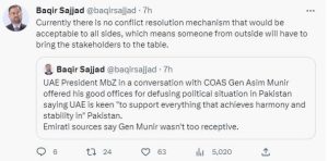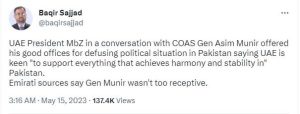 تفصیلات کے مطابق ڈان نیوز کے صحافی باقر سجاد نے ٹویٹر پر پیغام جاری کرتے ہوئے دعویٰ کیا کہ جنرل عاصم منیر اور متحدہ عرب امارات کے صدر محمد بن زید کے درمیان ٹیلیفونک رابطہ ہوا جس دوران محمد بن زید نے پاکستان میں جاری سیاسی کشیدگی اور تناﺅ کو ختم کرنے کیلئے اپنی خدمات کی پیشکش کی اور کہا کہ ” متحدہ عرب امارات پاکستان میں ہم آہنگی اور استحکام حاصل کرنے والی ہر چیز کی حمایت کرتا ہے “، تاہم اماراتی ذرائع کا کہناتھا کہ جنرل عاصم منیر نے پیشکش کو قبول کرنے میں دلچسپی نہیں دکھائی “۔